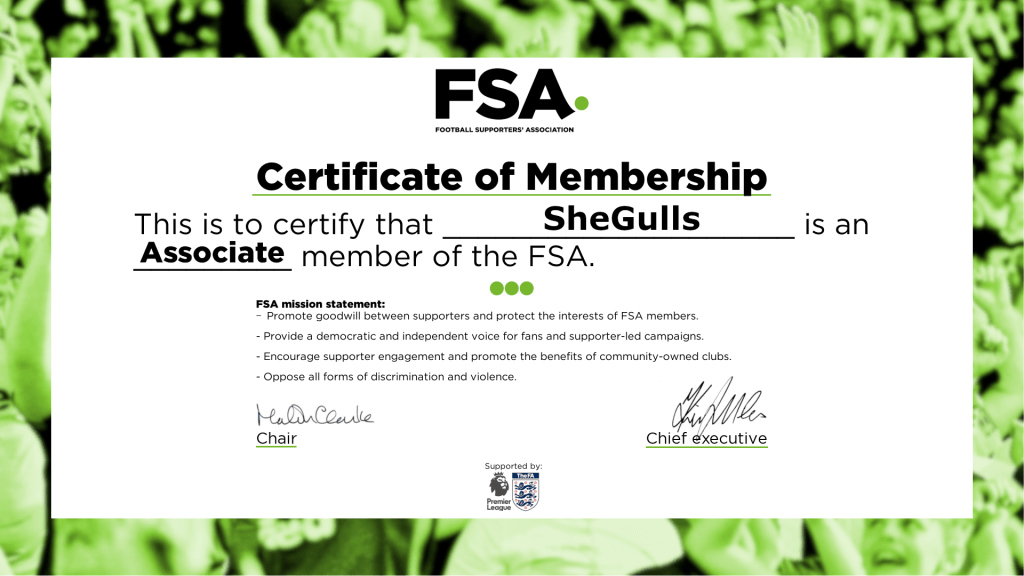 So I began to make explorations into this area. The FSA have been very helpful and I am proud to be a part of their Women’s Network, which has contact with the likes of the FA and WSL as well as other supporter groups. We are officially ‘Associate’ members of the FSA and are listed on their own website.