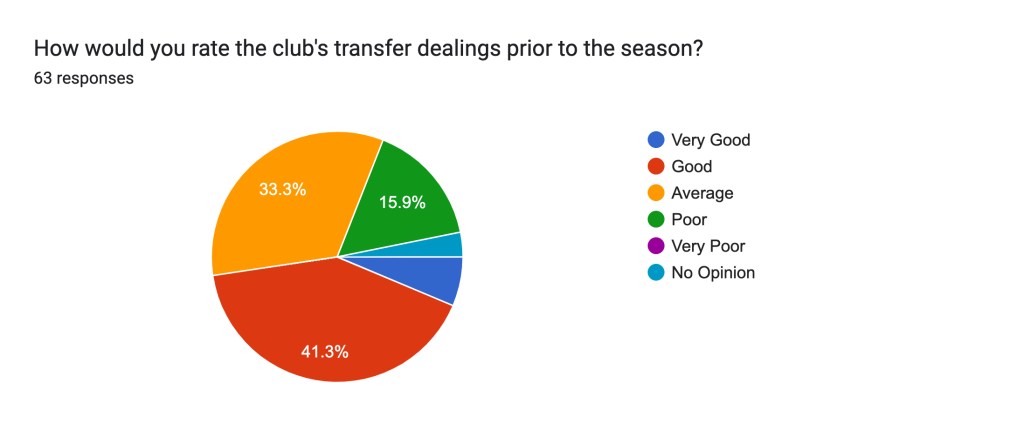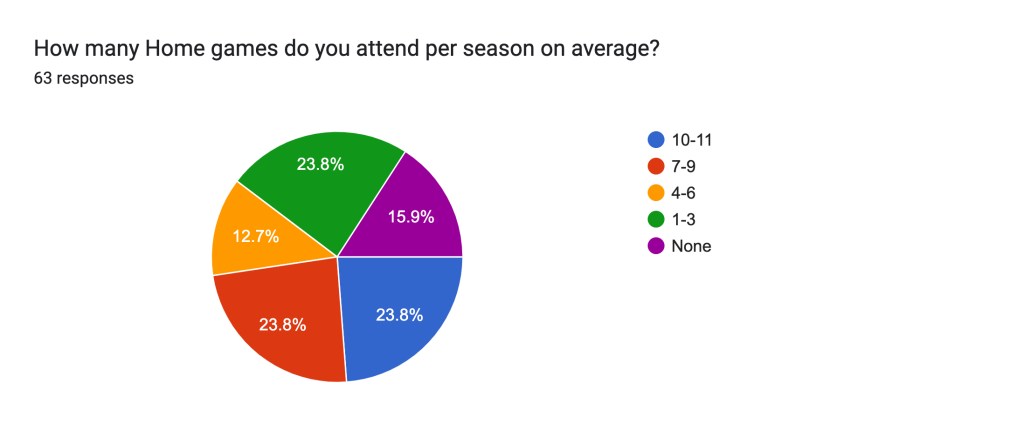 Analysis: Again a really good cross-section of fans. Bear in mind some people who answered ‘None’ may live abroad and therefore cannot attend games, but can still follow the team. Based on these stats, most fans (47.6%) attend at least 7 games on average per season.