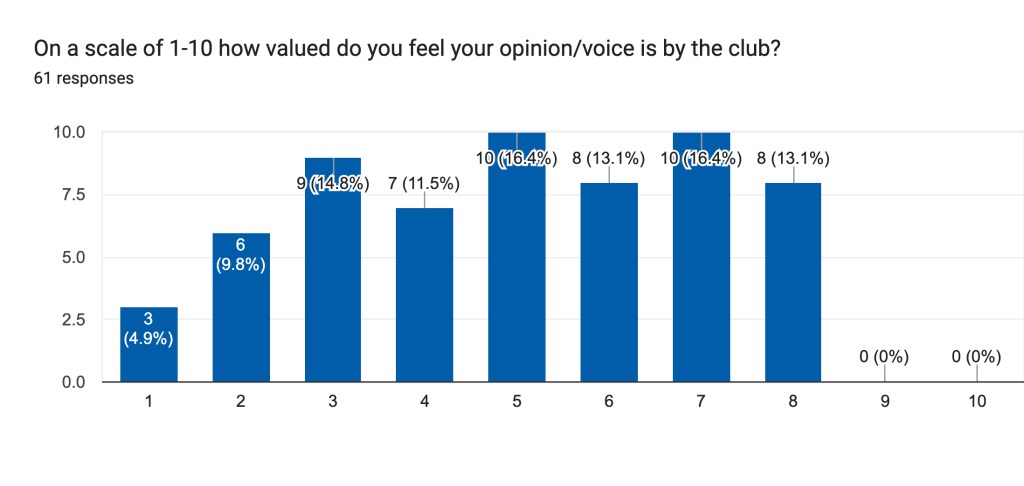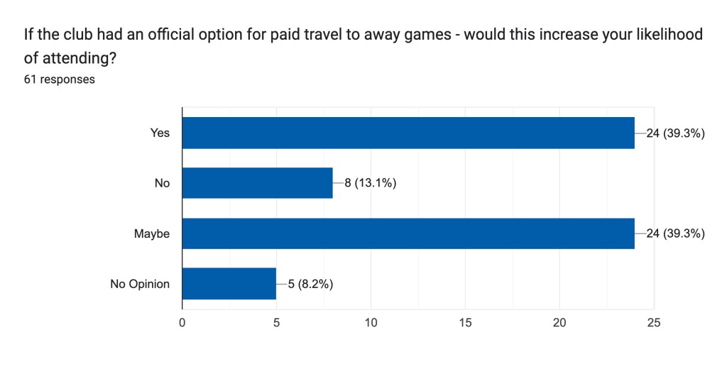 Analysis: Of the respondents, a sizeable 78.6% said that if the club had an option for paid away travel (like the existing men’s setup) that it would increase the prospect of them attending away fixtures. Half of those said it definitely would – a clear response in favour.