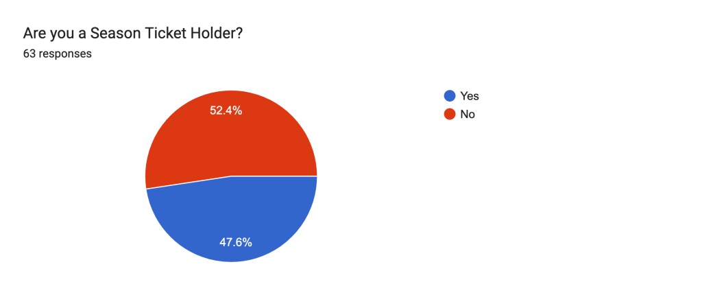 Analysis: It is good to see a mixture of both Season Ticket Holders and Non-Season Ticket Holders completing the survey. This provides a more rounded view of the club and means our numbers aren’t skewed by one demographic or the other.