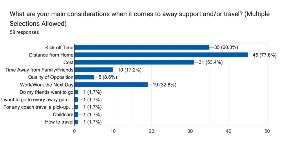 Analysis: Interestingly ‘Distance from Home’ came out as the top concern – one I share in truth, but I didn’t perhaps appreciate how much of an issue it was to other fans. Of course how far away the game is does contribute to our other top considerations ‘Cost’, ‘Kick-off Time’ and even ‘Work/Work the Next Day’ as fixtures are generally on a Sunday. I was slightly surprised ‘Quality of Opposition’ didn’t score higher, but this data suggests people would rather travel more locally, say for example West Ham away, as opposed to visiting a better team further away, like one of the Manchester clubs.