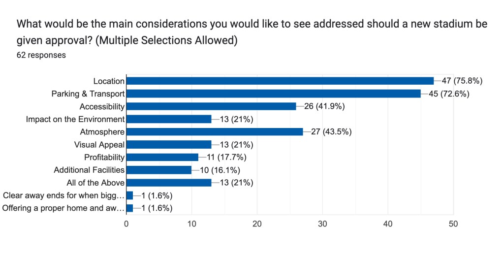 Analysis: ‘Location’ is out in front, which reinforces the suggestion that any new stadium should be built within Brighton & Hove City limits. ‘Parking & Transport’ goes hand in hand with location as, wherever the actual site may be, it must be accessible via as many modes of transport as possible, with room to accommodate aan increase in capacity. The other considerations come later, and are also vitally important – though I trust the club to have these topics high on their list to address.