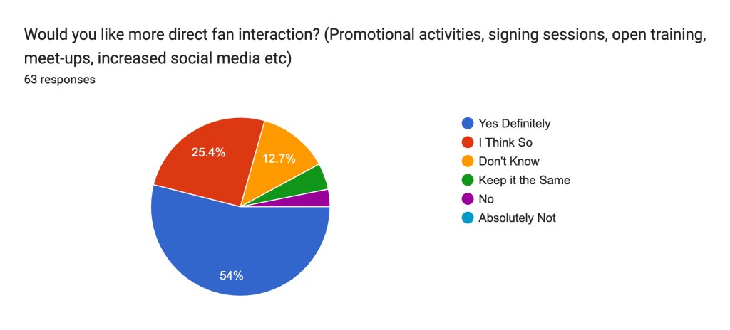 Analysis: An overwhelming majority of 54% think the club should definitely increase the level of direct fan interaction, if you add those who think so, but are perhaps not quite as adamant – the figure rises to 79.4%. Only two respondents voted No.